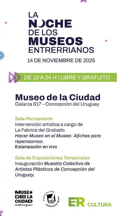La Noche de los Museos Entrerrianos será una oportunidad única para recorrer la historia, el arte y la memoria de Concepción del Uruguay, a través de las propuestas de los tres Museos Municipales, que conforman un polo museológico urbano ubicado a pocos pasos entre sí. La cita será extenderá de 19:00 a 00:00, invitando a redescubrir el patrimonio y a vivir la ciudad desde sus espacios culturales.