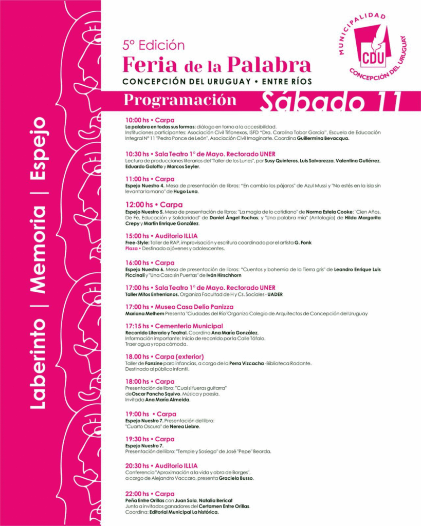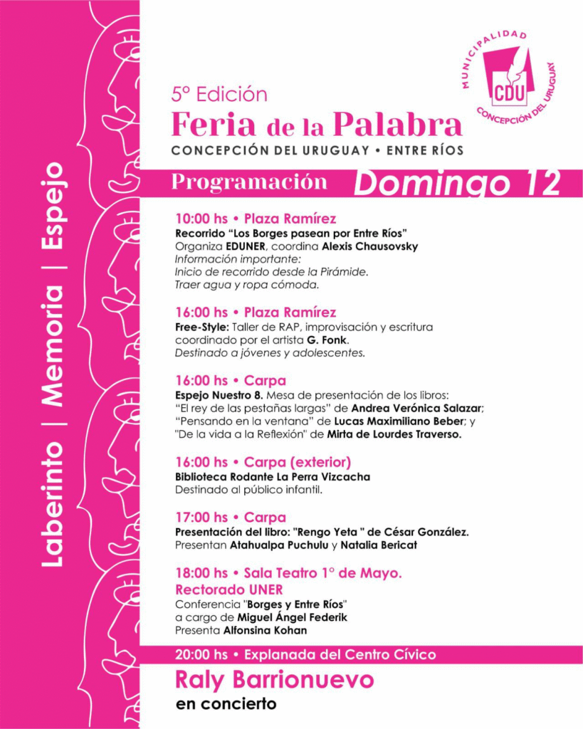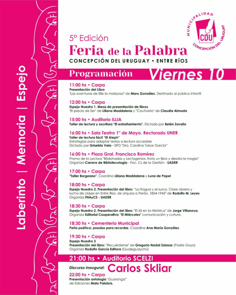 Durante el fin de semana largo del 10, 11 y 12 de octubre de 2025, Concepción del Uruguay será escenario de la quinta edición de la Feria de la Palabra, organizada por la Municipalidad bajo el lema “Laberinto. Memoria. Espejo”. La iniciativa reunirá a universidades, escritores, libreros, librerías, editoriales locales y distintos referentes del ámbito literario y cultural, consolidándose como uno de los encuentros más importantes de la región.