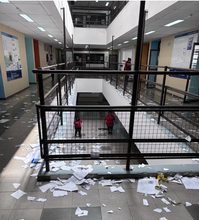 Molestos con la decisión, los casi 150 estudiantes del último año comenzaron a cantar contra el director, a insultarlo, voltearon los bancos de algunas aulas y hasta tiraron hojas de sus carpetas por todo el patio. No obstante, la situación se desmadró y hubo escenas que incluyeron la rotura de un matafuego y un parlante que fue arrojado al techo de uno de los salones (entre otras postales).