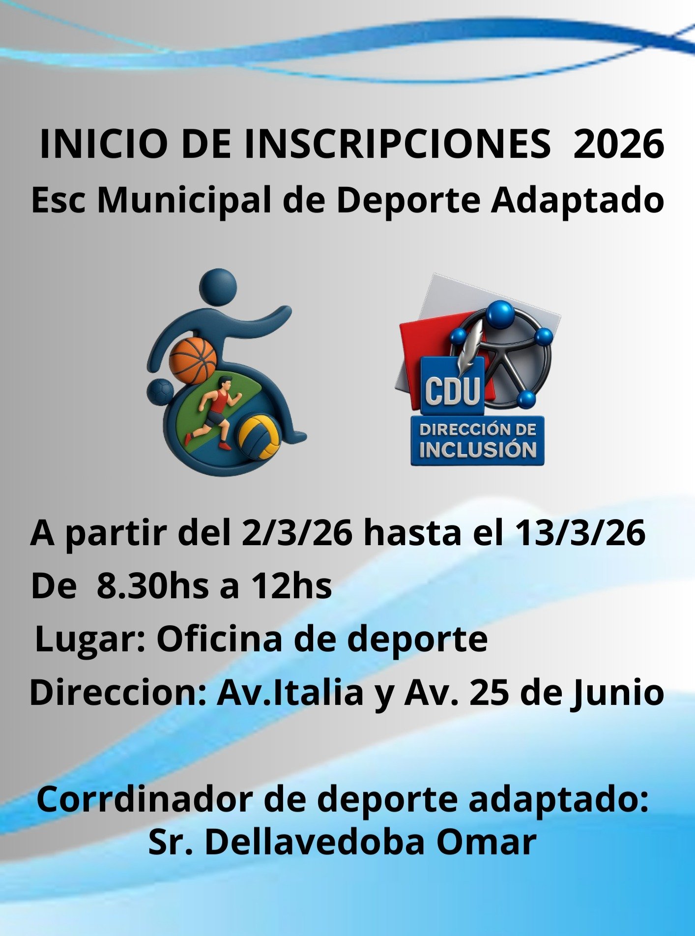 La Dirección para la Inclusión de las Personas con Discapacidad de Concepción del Uruguay informó que la inscripción para el ciclo 2026 de la Escuela Municipal de Deporte Adaptado se realizará del 2 al 13 de marzo. Será de 8.30 a 12 horas en la Dirección de Deportes, ubicada en Av. Italia y Av. 25 de Junio, siendo responsable el coordinador de Deporte Adaptado, Sr Omar Dellavedova.