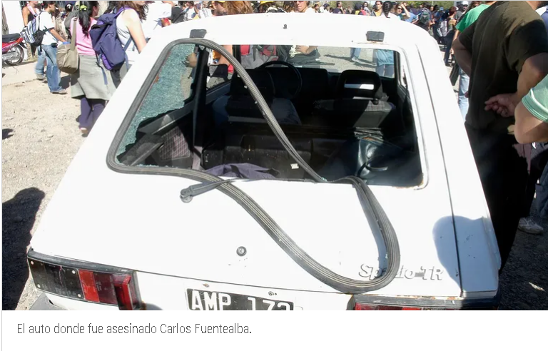 La fuerza disparó balas de goma y gases lacrimógenos. En plena retirada de los manifestantes, el policía José Darío Poblete (integrante del Grupo Especial de Operaciones Policiales de Zapala) arrojó desde dos metros una granada de gas que traspasó la luneta trasera de un Fiat 147 donde se encontraba el maestro. El proyectil impactó en su cabeza y le causó gravísimas heridas que terminaron con su muerte al día siguiente. Carlos Fuentealba tenía 40 años y dos hijas de 10 y 14. Su pareja, Sandra Rodríguez, también era docente.
