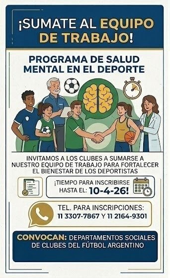 Convocatoria Abierta Programa de Salud Mental en el Deporte, desde los Departamentos Sociales de Clubes del Fútbol Argentino y organizaciones vinculadas con el deporte.